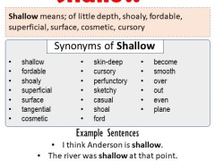 verb [vt. 及物动词](使)变浅 - I think he is shallow, vain and untrustworthy.