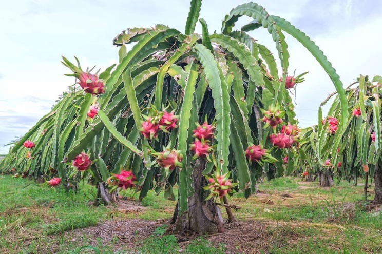 the fruit of several cactus species, also known as dragon fruit, with bright pink or yellow skin and white or red flesh containing small black seeds火龙果