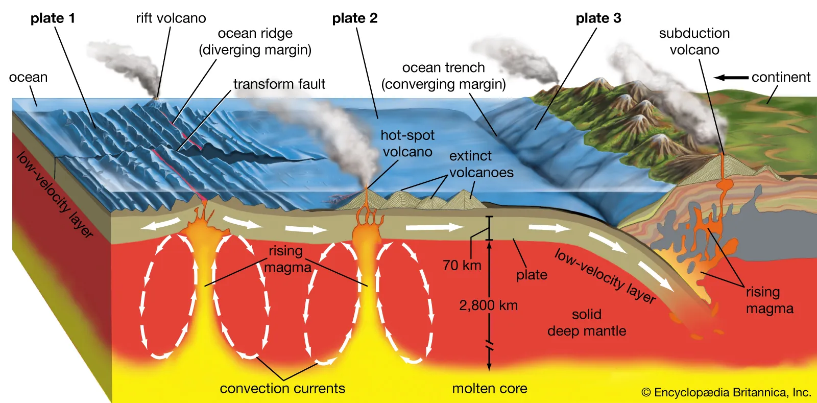 It is at the boundaries between plates that most of Earth's volcanism and earthquake activities occur.