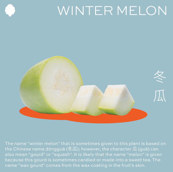 noun [专属名词]冬瓜:一种瓜类植物,产于热带亚洲地区,果实可食用,外表类似于南瓜,表面有一层蜡质粉末状的覆盖物。